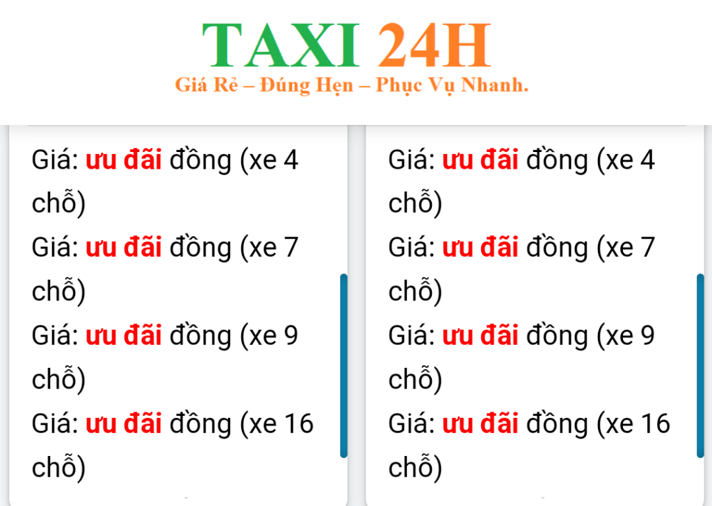 Dịch vụ taxi với hệ thống đặt xe trực tuyến giá rẻ nhất thị trường, đưa đón sân bay toàn cuốc, taxi giá rẻ, thuê xe đi du lịch, thuê xe đi công tác, thuê xe về quê có tài xế, các loại xe văn phòng ( xe không tem mào) đời mới, phong cách lịch sự, sẵn sàng phục vụ đưa đón quý khách mọi lúc mọi nơi. Hệ thống tổng đài hiện đại với phần mềm quản lý tiên tiến phủ toàn cuốc. Chúng tôi tự hào là một thương hiệu xe taxi giúp bạn di chuyển nhanh chóng và tiện lợi nhất